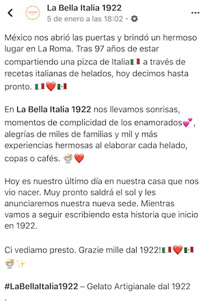 La Bella Italia, la heladería que ha sido un ícono de la Colonia Roma cierra un ciclo de casi 100 años, hoy suena a nostalgia, tantos personajes que pasaron por este establecimiento, convivieron y dejaron su huella en la larga Historia de la Bella Italia fundada en 1922.