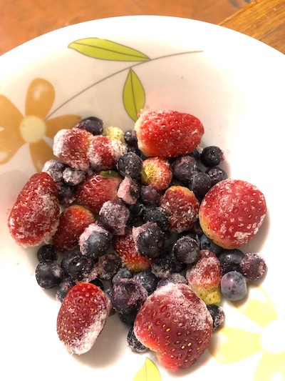Tengo un pequeño arbusto de Mora Azul, al cosecharlas, comprendí porqué son tan caras, de cada arbusto resultan realmente pocas, por lo que decidí ir recolectando y congelando hasta tener una cantidad que me permitiera hacer una mermelada con alguna otra fruta, en este caso elegí fresas.