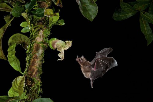 Murciélago, nombre científico: Guirópteros (Chiroptera) son mamíferos placentarios, cuyas extremidades superiores se desarrollaron como alas, por lo que son los únicos mamíferos que pueden volar, miden entre 29-33 mm con 2 gr. de peso hasta metro y medio de envergadura pesando poco más de 1 kilo, se orientan y cazan por medio de la Eco Localización, es decir que emiten ondas sonoras por la boca o la nariz y cuando éstas impactan en un objeto, producen ecos que rebotan en el objeto y vuelve a las orejas del murciélago.